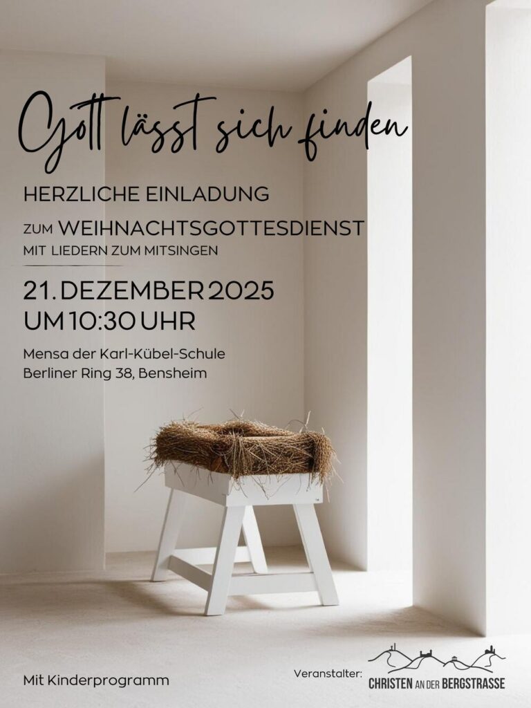 Am 21. Dezember 2025 findet ein gemeinsamer Gottesdienst in der Mensa der Karl-Kübel-Schule (Berliner Ring 38, Bensheim).