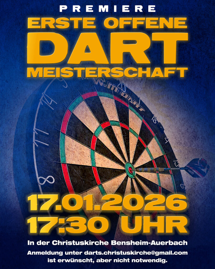 Männer aufgepasst: Am 17.01.26 um 17:30 Uhr findet unsere erste Dartmeisterschaft in der Christuskirche statt. Wir freuen uns auf euch! Meldet euch gerne vorher mit einer Mail unter darts.christuskirche@gmail.com an.